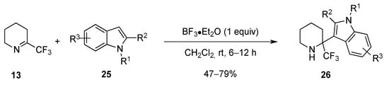 Indoles such 25 can also be involved in a Friedel-Craft reaction with imine 13 leading to the piperidines 26 in good yield (Scheme 12) [].