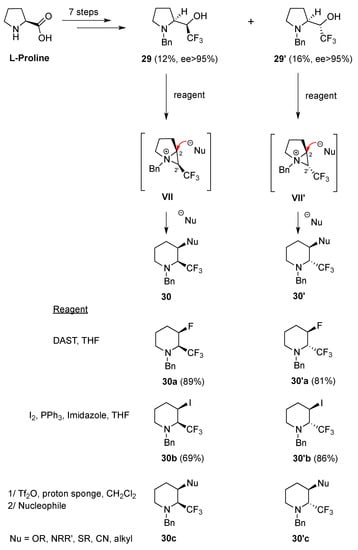 Prolinols 29 and 29′ were prepared from l-proline in a seven-step sequence []. When prolinols 29 and 29′ were treated with DAST, I2/PPh3 or by Tf2O, followed by the addition of different nucleophiles (alcohols, amines, thiols, cuprates, cyanides), a diversity of 2-(trifluoromethyl)- 3-substituted piperidines 30 and 30′ were obtained with good diastereo- and enantioselectivities (de > 94% and ee > 99%). The regioselective attack of the nucleophiles on the aziridinium intermediates VII/VII′ is due to the presence of the CF3 group (Scheme 14) [,].