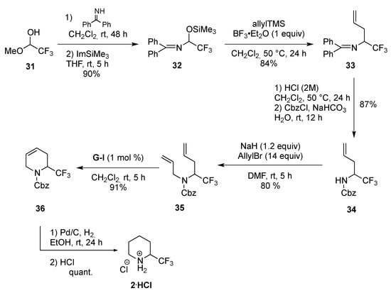 The ammonium salt of the 2-trifluoromethylpiperidine 2.HCl was formed from 36, which was obtained from the α-trifluoroaminodiene 35 when treated with G-I. This diene has been synthesized in six steps from the hemiacetal 31 which was transformed into imine 32 by treatment with the imine of benzophenone followed by a silylation step (ImSiMe3). After an allylation under acidic conditions (allylTMS, BF3.OEt2), followed by a deprotection/protection sequence, the allyltrifluoroamine 34 was isolated and allylated to produce the piperidinic core precursor 35. Thus, after treatment of 35 with G-I catalyst (1 mol %) in dichloromethane at rt, the unsaturated piperidine 36 was isolated in 91% yield. After hydrogenation (Pd/C, EtOH, rt, 24 h) and treatment with HCl, 2.HCl was isolated quantitatively (Scheme 15) [,]. Compared to the synthesis of 2 from pipecolic acid the synthesis of 2 from 31 is more efficient in terms of yield (47.9% versus 9.6%).