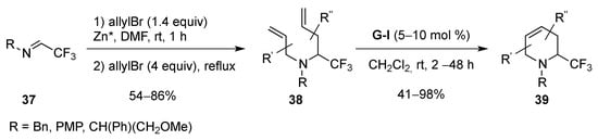 A shorter synthesis of unsaturated piperidines from imines 37 using a Barbier-type reaction (allylBr, Zn, DMF, rt) followed by a N-allylation has been reported. The resulting dienic amino compound 38 was isolated in good yied. After treatment with G-I (5–10 mol %) the unsaturated piperidines 39 were isolated (Scheme 16) [].