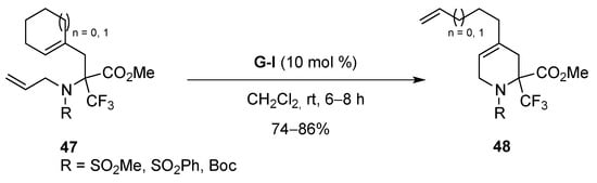 When the ring-opening metathesis (ROM)/ ring-closing metathesis (RCM) was applied to 47, using the G-I catalyst (10 mol %), the unsaturated piperidines 48, substituted at C4, were isolated in good yields (74%–86%) (Scheme 19) [].