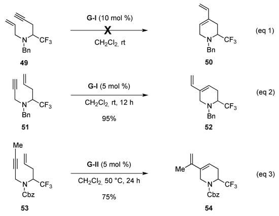 It is worth noting that a substituent at C4 could not be introduced on the piperidinic core by using a RCM applied to enyne 49 (Scheme 20, eq. 1). On the contrary, 2-(trifluoromethyl) unsaturated piperidines substituted at C5 can be produced by applying a RCM to enyne 51. When this latter was treated with G-I (5 mol %) the resulting unsaturated piperidine 52 was obtained with an excellent yield (95%) (Scheme 20, eq. 2).