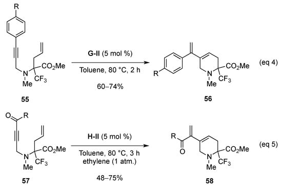It is worth mentioning that in the case of 55, when the aryl group is substituted in the para position the yields in 56 are good (60%–74%). On the contrary, when the aryl group is substituted in the ortho position, 55 is not transformed into 56 whatever the catalyst used, either the G-II or the GH-II catalysts [].