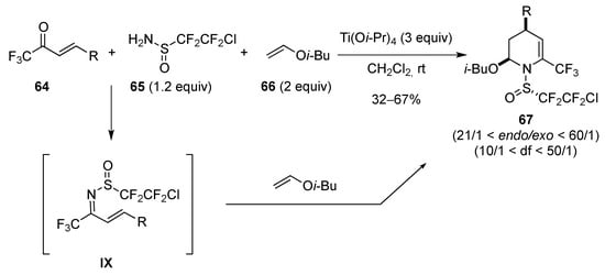 The unsaturated piperidine 67 was obtained from an aza Diels-Alder reaction between the iso-butyl vinyl ether 66 and the sulfinimine intermediates IX generated in situ from the trifluoromethyl α,β-unsaturated ketone 64 and the sulfinamine 65. In this aza Diels-Alder reaction, the HOMO orbital of 66 reacts with the LUMO orbital of the azadienes IX. The trifluoromethyl-piperidines 67 were obtained with a good diastereoselectivity in favor of the endo product. In addition, when the reaction was performed with an optically active sulfinamine, the cycloadduct was obtained with a good enantioselectivity (ee > 99%) (Scheme 22) [].