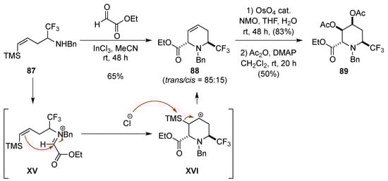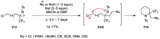 The intramolecular nucleophilic displacement of a good leaving group by an amine is one of the must common methods to prepare six-membered nitrogen heterocycles. This method was used to synthesize 2-trifluoromethylpiperidines 114 from the highly reactive aziridines 113. The high reactivity of 113 is due to the presence of the trifluoromethyl group and the N-tosyl group. The attack of aziridine 113 by a variety of nucleophiles was very regioselective and produced intermediates XVII that cyclized according to an intramolecular nucleophilic substitution of the chloride to produce 114 (Scheme 34) [].