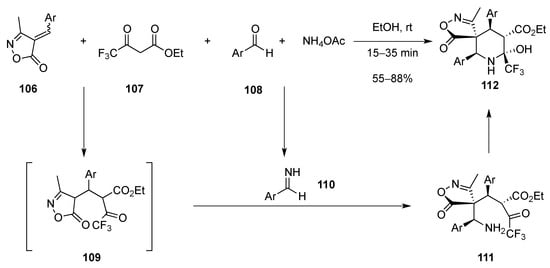 Highly substituted 2-trifluoromethylpiperidines 112 were obtained from isoxazoles 106, trifluoromethylketoester 107, aldehydes 108 and ammonium acetate in ethanol. In this multicomponent reaction, isoxazoles 106 react with the enolized β-ketoester 107, to form intermediates 109 which can react with imines 110 (obtained by condensation of aldehydes 108 with NH4OAc) to produce the aminotrifluoromethylketones 111. The intramolecular attack of the amino group to the highly reactive trifluoromethylketones led to the trifluoromethylpiperidines 112 (Scheme 33) [].