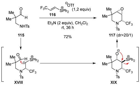 The annulation of aminoaldehyde 115 was realized by an intramolecular attack of a diphenyl sulfonium species on an aldehyde. When aminoaldehyde 115 was reacted with the trifluoromethyl- vinyl diphenylsulfonium 116, the ylide intermediate XVIII was formed and a cyclization took place to produce XIX which led to the piperidino-epoxide 117. It is worth noting that 117 was isolated with a good yield (72%) and a good diastereoselectivity (dr > 20:1) (Scheme 35) [].