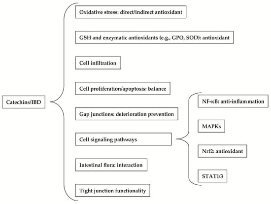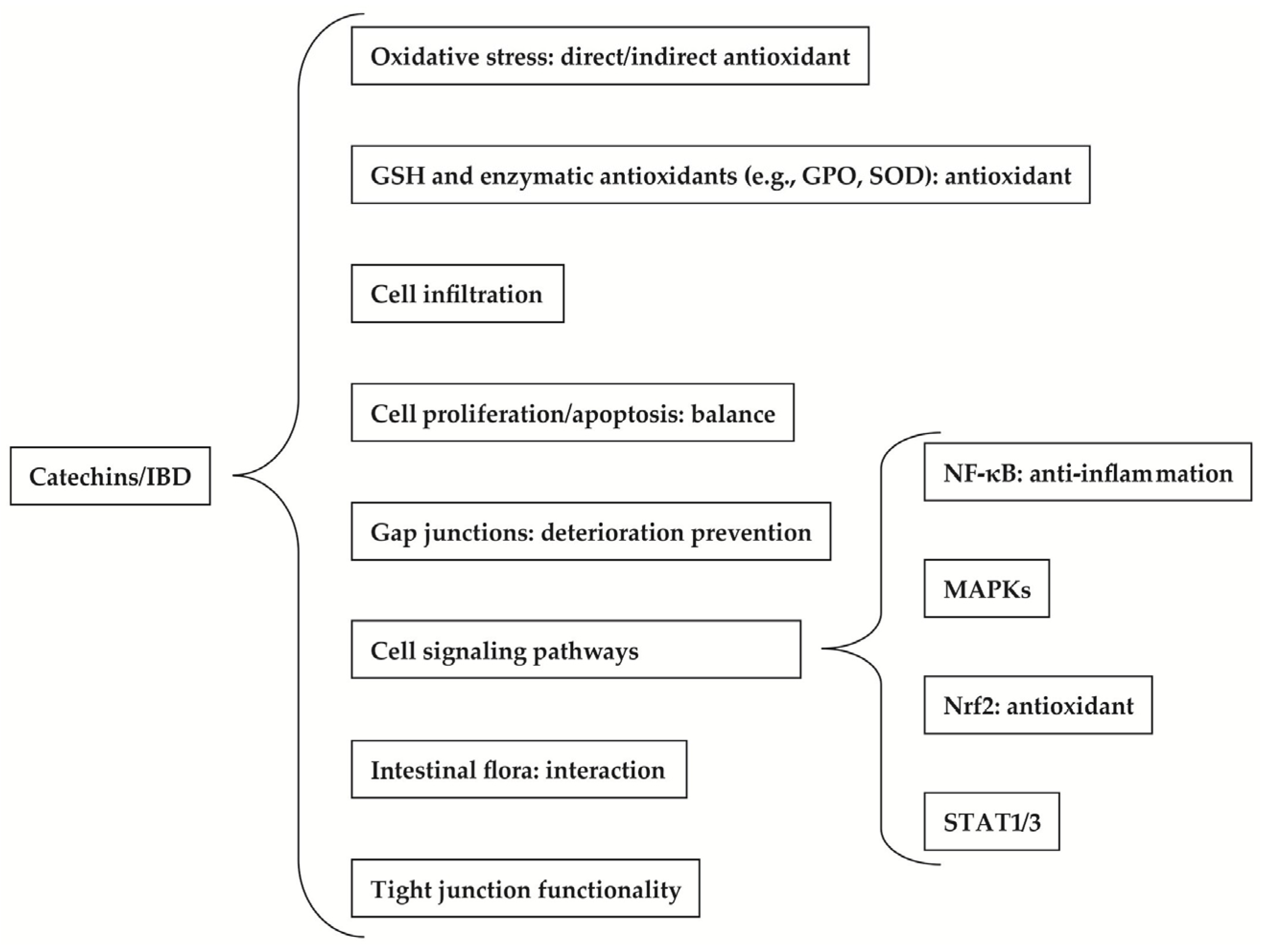 It has not yet been entirely made clear that the mechanisms by which catechins benefit inflammatory diseases, such as IBD, while human experiments demonstrating that catechins can improve IBD are still scarce so far. However, there is abundant evidence showing that catechins may work through a combination of oxidation inhibition, alteration of cellular signaling, and regulation of intestinal flora [29,53,76].
