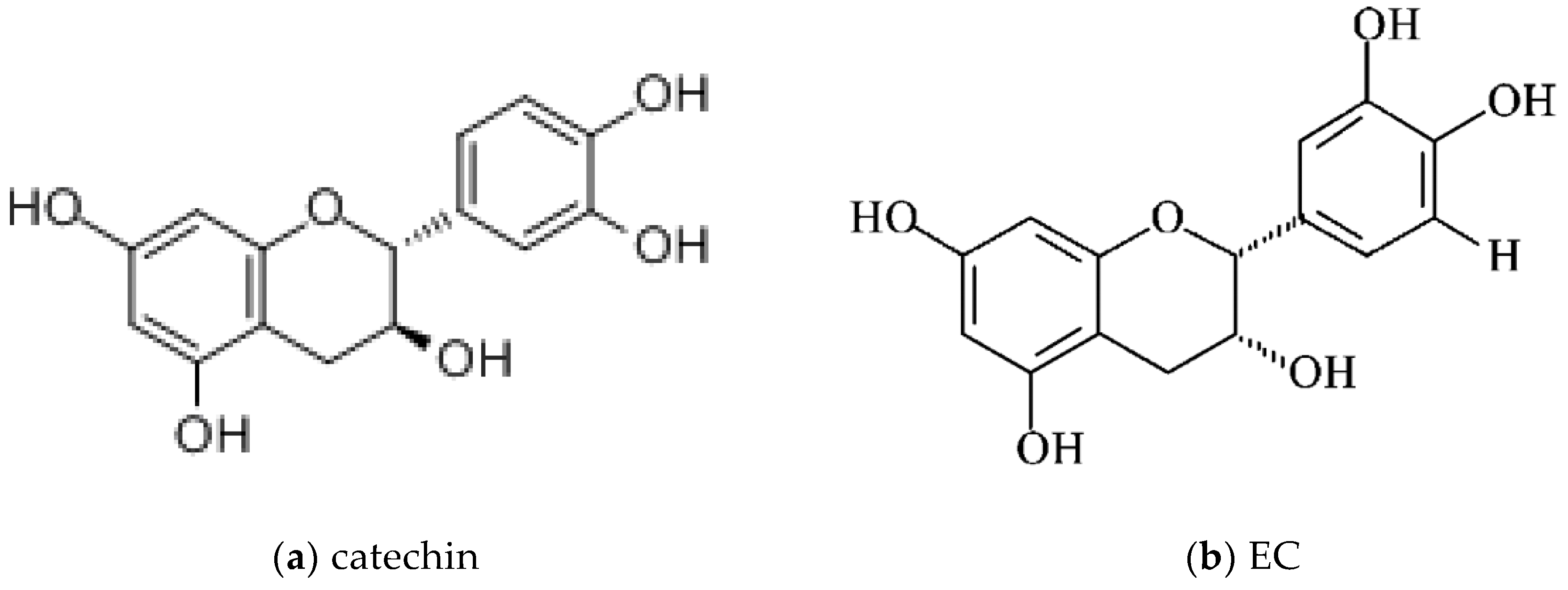 - Inoue, Y.; Trevanich, S.; Tsujimoto, Y.; Miki, T.; Miyabe, S.; Sugiyama, K.; Izawa, S.; Kimura, A. Evaluation of catechin and its derivatives as antioxidant: Recovery of growth arrest of Escherichia coli, under oxidative conditions. J. Sci. Food Agric. 1996, 71, 297–300. [Google Scholar] [CrossRef]
