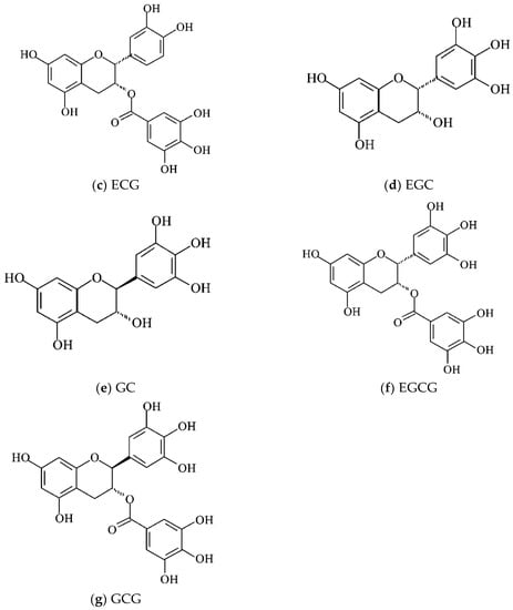 The chemical structures of major kinds of catechins. (a) catechin: (2R,3S)-(+)-catechin; (2R,3S)-2-(3,4-dihydroxyphenyl)-3,4-dihydro-2H-chromene-3,5,7-triol; (b) EC: (2R,3S)-(–)-epicatechin; 2-(3,4-Dihydroxyphenyl)-3,4-dihydro-2H-1-benzopyran-3,5,7-triol; (c) ECG: (2R,3R)-(–)-epicatechin gallate; (2R,3R)-2-(3,4-dihydroxyphenyl)-3,4-dihydro-1(2H)-benzopyran-3,5,7-triol 3-(3,4,5-trihydroxybenzoate); (d) EGC: (2R,3R)-(–)-epigallocatechin; (2R,3R)-2-(3,4,5-trihydroxyphenyl)-3,4-dihydro-1(2H)-benzopyran-3,5,7-triol; (e) GC: (2S,3R-(–)-gallocatechin; (2S,3R)-2-(3,4,5-trihydroxyphenyl)-3,4-dihydro-1(2H)-benzopyran-3,5,7-triol; (f) EGCG: (2R,3R)-(–)-epigallocatechin gallate; (2R,3R)-2-(3,4,5-trihydroxyphenyl)-3,4-dihydro-1(2H)-benzopyran-3,5,7-triol 3-(3,4,5-trihydroxybenzoate); (g) GCG: (2S,3R)-(–)-gallocatechin gallate; (2S,3R)-2-(3,4,5-trihydroxyphenyl)-3,4-dihydro-1(2H)-benzopyran-3,5,7-triol 3-(3,4,5-trihydroxybenzoate).