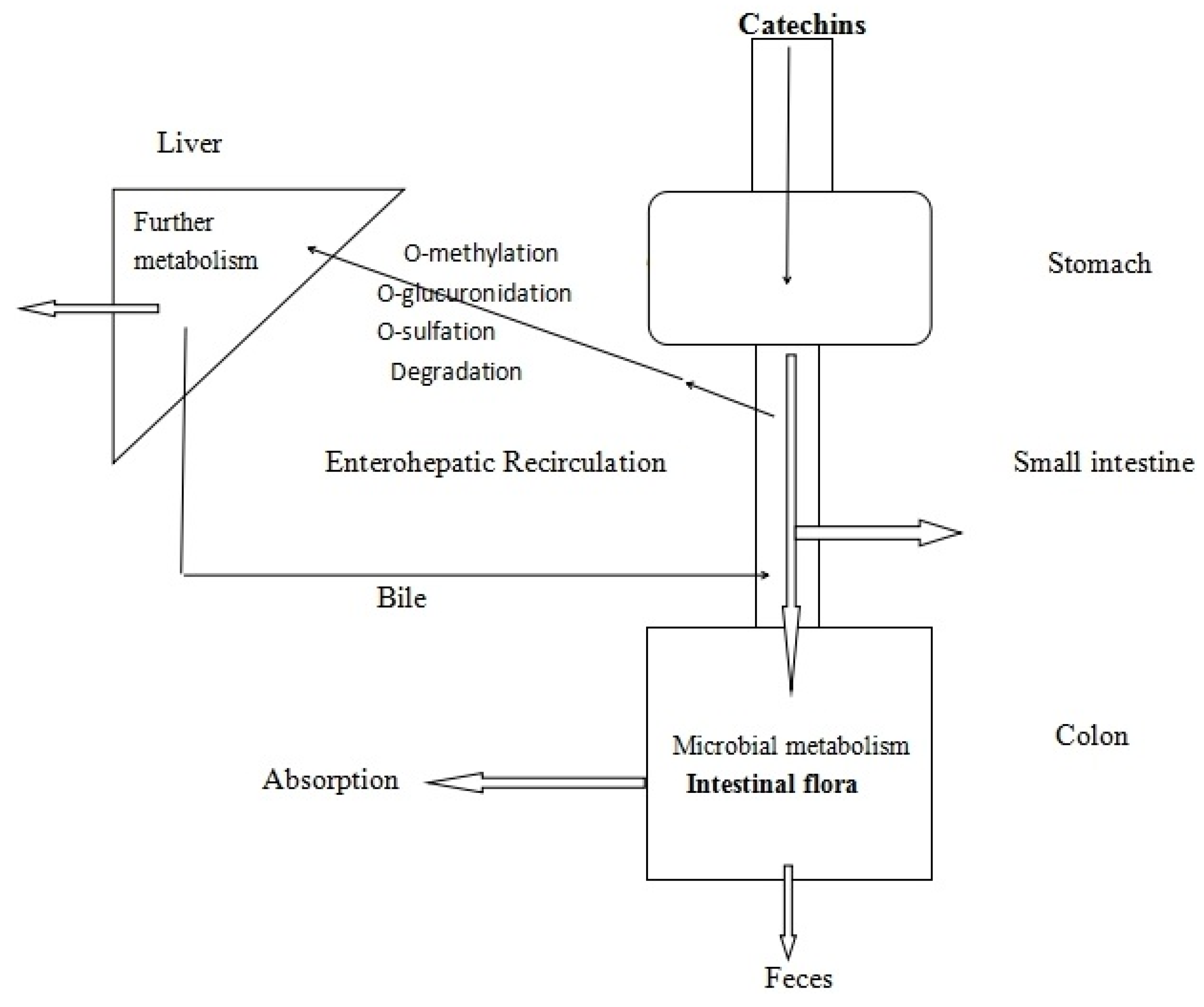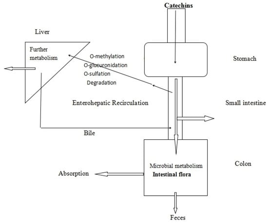 Catechins can be absorbed by the gastrointestinal tract (GIT), as catechins themselves, and their metabolites, are (mainly) formed in the acidic environment of the stomach, enterohepatic recirculation, the mucosa of the small intestine, and the microbial metabolites in the colon [35,66] (Figure 3). All catechins may undergo three types of metabolic pathways: methylation, glucuronidation, and sulfation in the liver and intestinal tissues in humans [67], like (epi)catechin transfering into plasma itself, or the corresponding glucuronide, sulfate, and methylated metabolites produced by uridine-5′-diphosphate glucuronytransferase, sulfotransferase, and cate-chol-O-methyltransferase enzymes [66]. Stalmach et al. have revealed that some flavan-3-ol monomers are absorbed in the upper part of the GIT in a human study [68]. Then, most of the ingested flavan-3-ols and their metabolites, formed in the upper GIT and transported back into the intestinal lumen, will reach the large intestine. On the deglucosidation function of mammalian β-hydrolases like lactase-phlorizin hydrolase (LPH) in the intestinal epithelial cells, and some hydrolases from the intestinal microflora like glucuronidase, catechins, and types of flavonoids, will finally form the corresponding aglycones, then be absorbed into human circulation and undergo further transformation and metabolism, which is believed to be the first and important step in the absorption of flavonoids [69,70]. Under the function of gut microbiota, they will also turn into phenolic acids and lactone derivatives, which will be absorbed or pass in the feces [65]. The microbial metabolites and their hepatic conjugates are distributed to tissues and are excreted by urine [71]. Investigations in humans have underlined that more of the flavan-3-ol metabolites were derived from gut flora-associated catabolites coming from the colon rather than from the upper GIT in the body [66]. As shown in a human study, colonic flora-derived flavan-3-ol catabolites (polyhydroxyphenyl-γ-valerolactones) were the main substance in urine, with higher concentrations than flavan-3-ol conjugates [72].