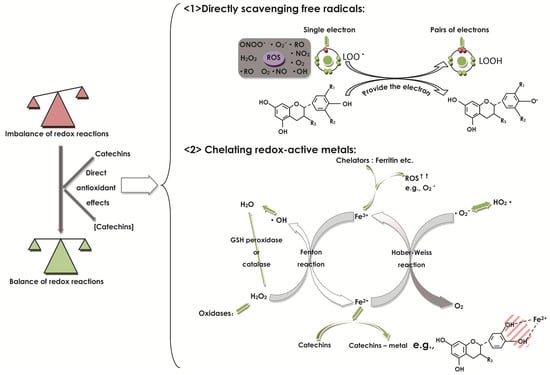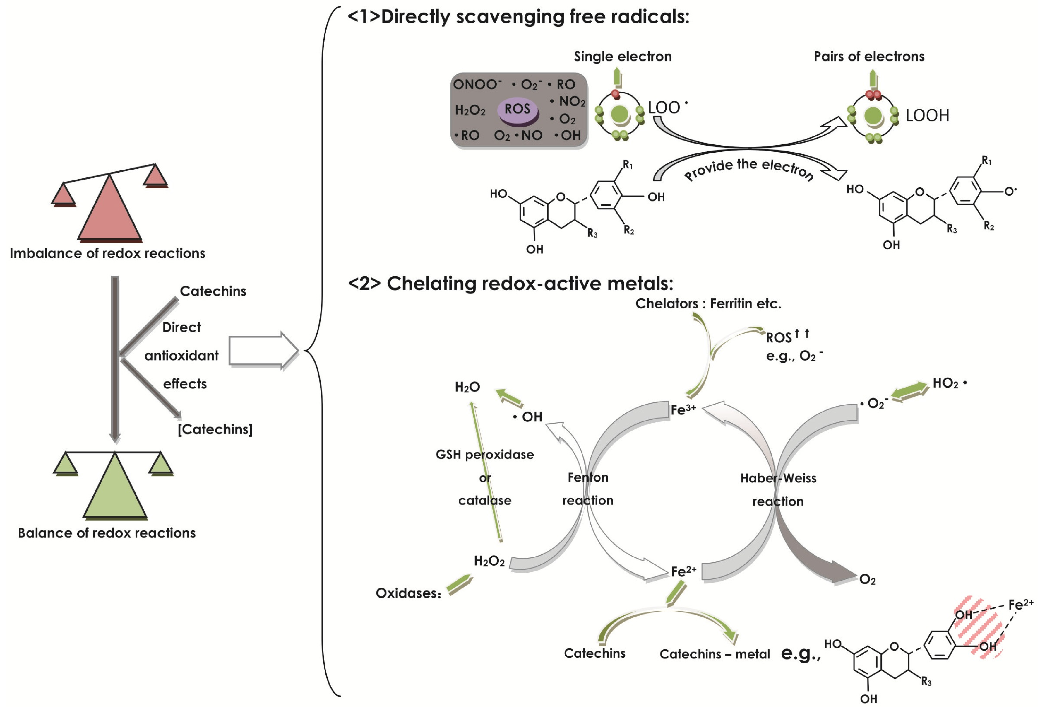 Catechins can exert direct antioxidant effects by reacting with free radicals to disrupt the free radical chain reaction and chelating redox-active metals.