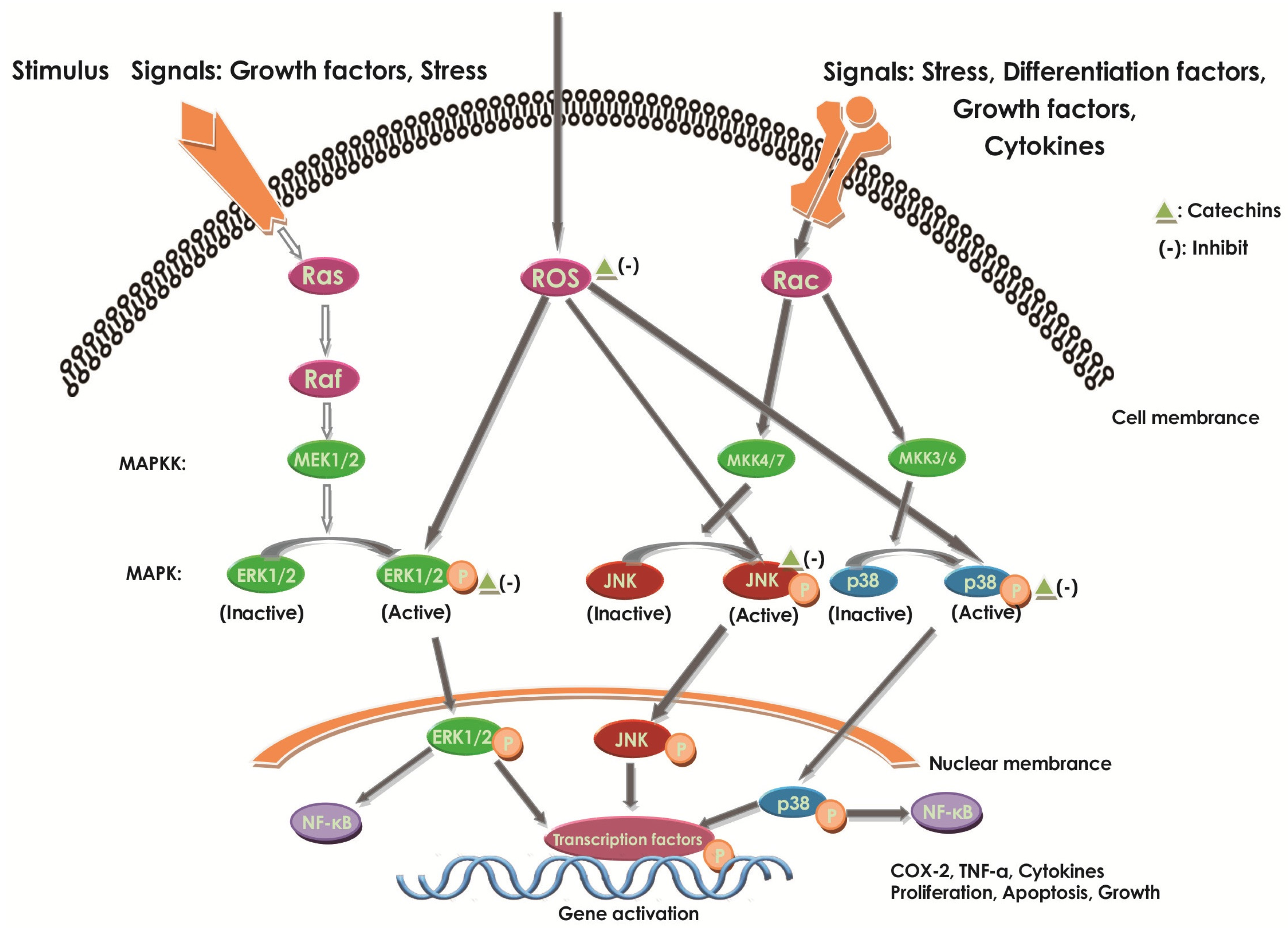 Catechins show an inhibition of the MAPK cascade pathway through the inhibition of the phosphorylation of ERK1/2, JNK, and p38.