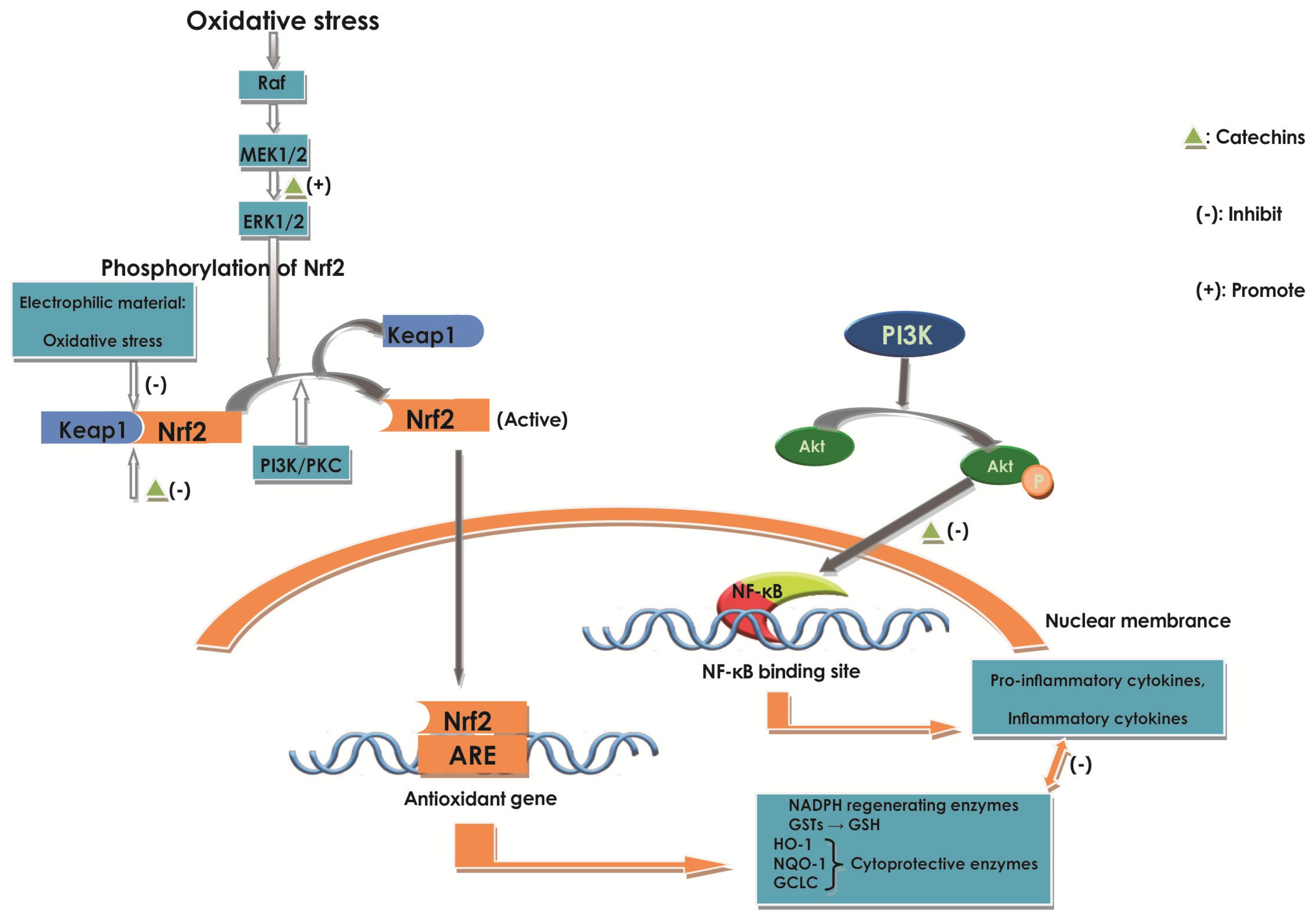 Catechins can activate Nrf2 by enhancing the phosphorylation of ERK1/2, then regulate the activation of Nrf2 by directly inhibiting Keap1-Nrf2 interaction or enhancing ERK1/2 expression. Catechins can regulate the Nrf2 by acting on NF-κB.