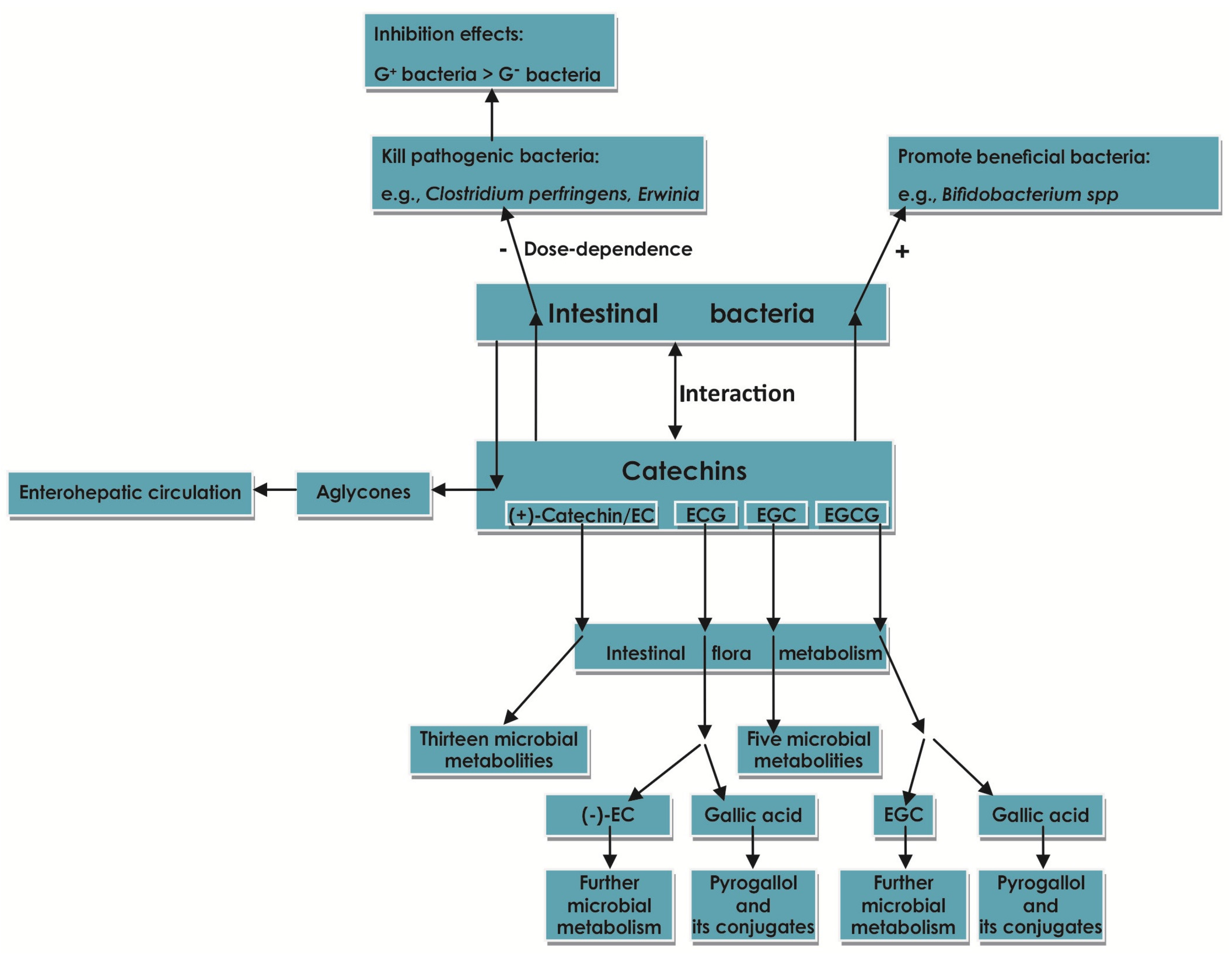The toxicity of catechin, which has many diastereoisomers like EC and ECG, to bacteria membranes, extracellular proteins, DNA, and morphology was analyzed by Fathima et al., using Gram-positive bacteria (B. subtilis) and Gram-negative bacteria (E. coli). It was demonstrated that catechin could benefit bacteria in a dose of about 10 μM in B. subtilis and about 12 μM in E. coli. If the concentration was higher than that, catechin possessed a negative function on bacteria through the oxidative damage resulting in the change in membrane permeabilization and membrane liposomes [36]. This conclusion shows that catechin has a dual function that both benefits and harms to bacteria in a dose-dependent manner, which is consistent with a previous study. The authors also revealed that the inhibition of catechin against bacteria was more obvious in the Gram-positive bacteria (B. subtilis) than Gram-negative bacteria (E. coli) in all of the permeabilization changes, DNA damage, and stress protein expression [36]. Catechins have a stronger affinity to the peptidoglycan of Gram-positive bacteria than the negatively-charged liopolysaccharides in the membrane of Gram-negative bacteria, resulting in greater permeation, absorption of catechins, and more injury to the cell membrane in Gram-positive bacteria [129,130]. Additionally, catechins can cut the supercoiled DNA into open linear or circular DNA, acting like restriction enzymes in B. subtilis DNA, but not in E. coli DNA. The extracellular proteins can also be elevated in B. subtilis than E. coli when both are treated with catechin [36]. In addition, polyphenols can influence gut microbiota, and the gut microbiota can also have an influence on the polyphenols (Figure 8), such as cleaving it to be a kind of energy foundation, especially for bacteroidetes. This may be one of the reasons for the change in intestinal microbiota [35].
