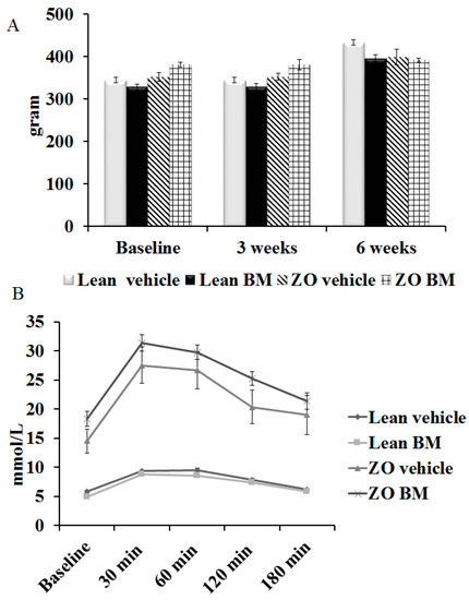 (A) Bitter melon (BM) extract effect on body weight. Six-week time course monitoring of body mass was conducted on Lean or Zucker Obese (ZO) rats (n = 10 animals in each group), fed daily by gavage, with mucin–water vehicle, or BM extract of 400 mg/kg body weight, at outset (Baseline) and the three-week and six-week time points. Results are provided as average body mass, in grams, ±SEM; (B) Effect of bitter melon extract on serum glucose metabolism. Lean or Zucker Obese (ZO) rats (n = 10 animals per group), fed daily by gavage, for six weeks with mucin–water vehicle, or BM extract of 400 mg/kg body weight, are evaluated for fasting serum glucose content immediately prior to oral administration of 3 g of glucose per kg of body weight (Baseline). Results are provided as average serum glucose content, in mmol/L of peripheral blood, ±SEM.