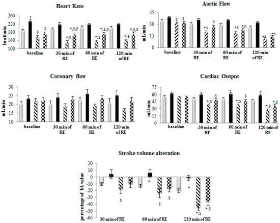 Following the six-week of treatment period, rats were anesthetized with an intraperitoneal pentobarbital sodium injection (60 mg/kg), with heparin as an anticoagulant (1000 U/kg). After induction of deep anesthesia, chest cavities were opened, hearts were excised and placed in ice cold modified Krebs-Henseleit bicarbonate (KHB) buffer (118 mM NaCl, 5.8 mM KCl, 1.8 mM CaCl2, 25 mM NaHCO3, 0.36 mM KH2PO4, 1.2 mM MgSO4, and 5.0 mM Glucose) to prevent damage of cardiac tissue. After excision, aortas were cannulated and each heart was perfused with modified Krebs-Henseleit buffer at a filling pressure of 100 cm of water (10 kPa), using the non-working mode of a Langendorff apparatus for 5 min to flush out blood from the heart. During the washout period, pulmonary veins were cannulated, and heart functions were assessed in working mode at a filling pressure of 17 cm (10 kPa) of water with KHB buffer. A total of 10 min of working mode activity was sustained to stabilize the cardiac activity. At the end of 10 min of working mode perfusion, baseline cardiac parameters including heart rate (HR), aortic flow (AF), coronary flow (CF), cardiac output (CO) and stroke volume alteration (devSV) were registered. Next, 30 min of ischemia was induced by closing the atrial inflow and aortic outflow lines. At the end of ischemic periods, reperfusion was initiated by opening the atrial inflow and aortic outflow cannulas. The first 10 min of reperfusion was conducted in Langendorff mode to prevent development of fatal ventricular arrhythmias. If ventricular fibrillation was observed at the onset of reperfusion, the heart was defibrillated with a square wave impulse. After the first 10 min of Langendorff reperfusion, hearts were switched to working mode for 110 minutes. At 30, 60 and 120 min of the repefusion period, cardiac parameters were recorded to monitor the postischemic recovery of the myocardium. A continuous pressure signal was recorded during the whole experiment with the help of a pressure transducer (ADInstruments, PowerLab, Castle Hill, Australia). HR and AOP were calculated from the continuously recorded pressure signal. AF was measured by a calibrated flow meter, while CF was assessed by time-collecting the coronary effluent. Cardiac output (CO) was calculated as the sum of AF and CF, while stroke volume (SV) was the ratio of CO and HR. Stroke volume alteration was calculated as a ratio of SV and baseline SV [24].