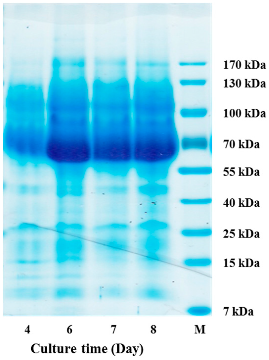 3.4. Separation of Fermented Crude Enzyme from the Culture of Aspergillus niger