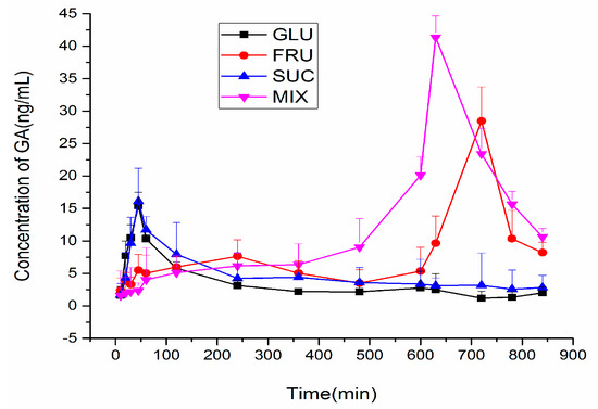 It is not easy to change GA into a polymer, and it is always seen as a monomer in the gastrointestinal tract, so it is easy to digest. As related literatures have reported, the concentration of GA is inclined to increase to the maximum concentration, but it also rapidly dropped [28,29]. This is consistent with the result showed above for the pharmacokinetics of GA when administered with GA solution alone. However, we noticed that the honey has a robust effect on the pharmacokinetics of GA; it makes the absorption and metabolism process of GA in mice blood become much slower. Furthermore, three components (glucose, fructose and sucrose) of honey were observed for their effect on GA pharmacokinetic processes. The results showed the honey exhibited a moderate activity, which correlates well with its fructose composition.