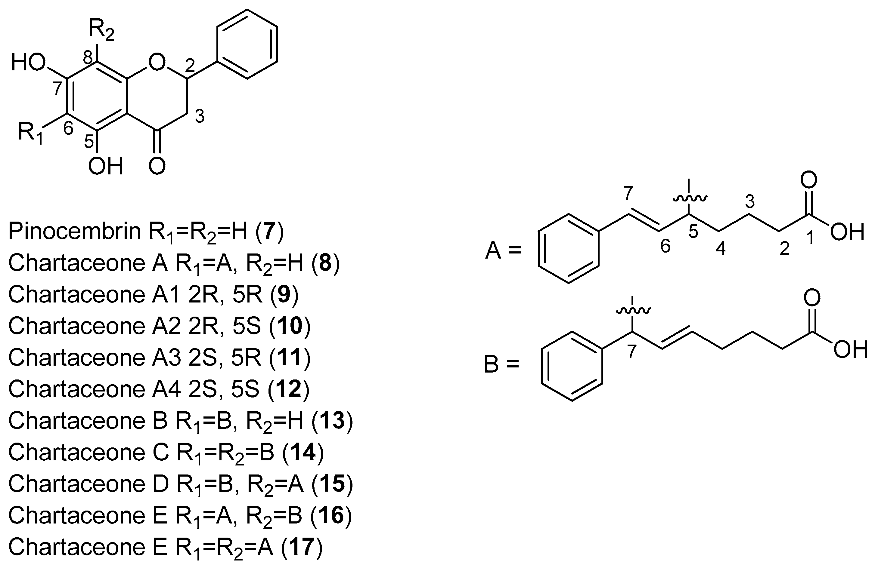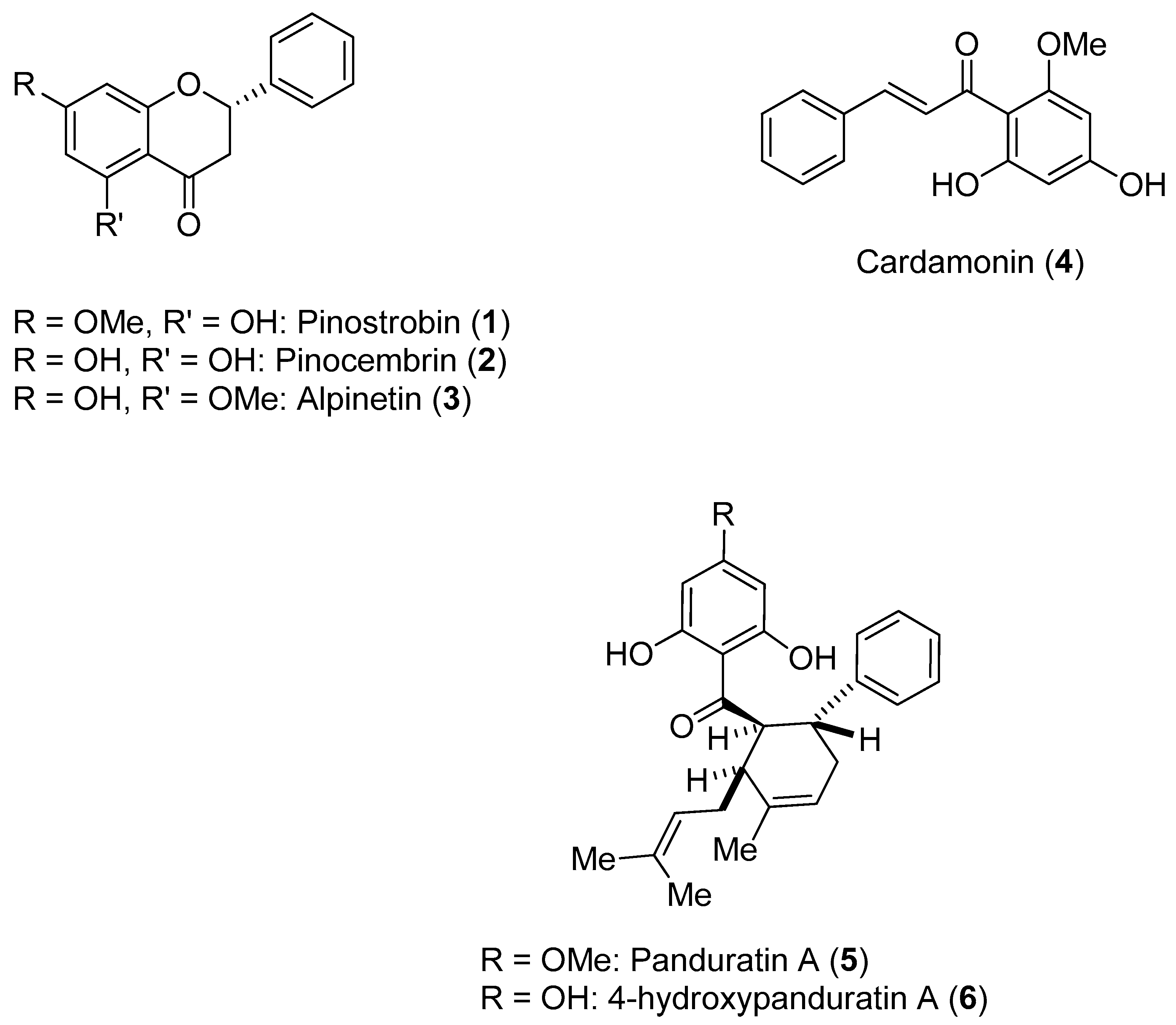 Boesenbergia rotunda (L.) Mansf. Kulturpfl (Br) is a member of the ginger family. A phytochemical investigation of yellow rhizomes of this species from Thailand led to the isolation of six compounds, which are shown in Figure 1.