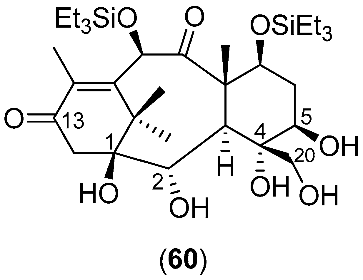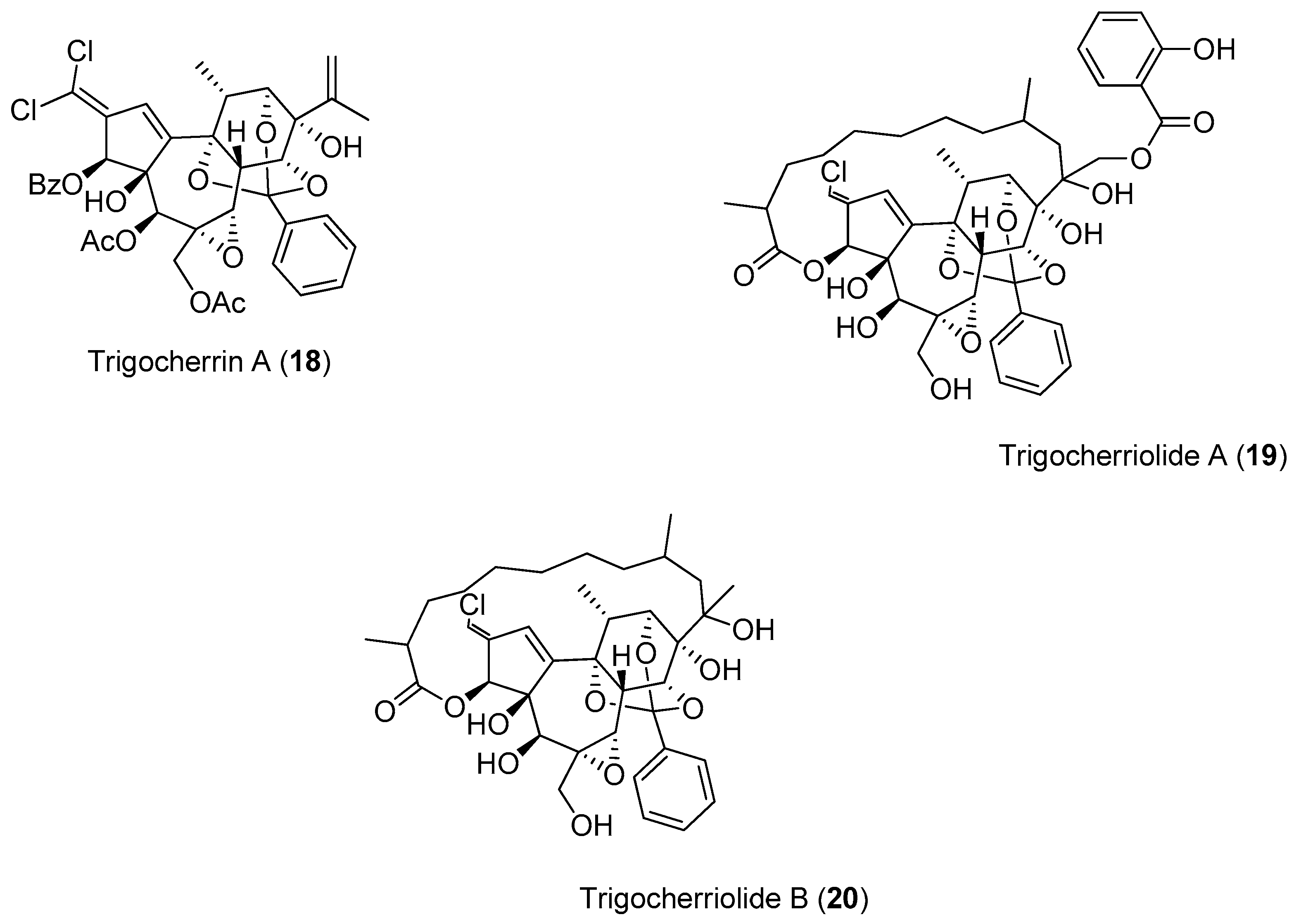- Allard, P.-M.; Leyssen, P.; Martin, M.-T.; Bourjot, M.; Dumontet, V.; Eydoux, C.; Guillemot, J.-C.; Cannard, B.; Poullain, C.; Guéritte, F.; et al. Antiviral chlorinated daphnane diterpenoid orthoesters from the bark and wood of Trigonostemon cherrieri. Phytochemistry 2012, 84, 160–168. [Google Scholar] [CrossRef] [PubMed]