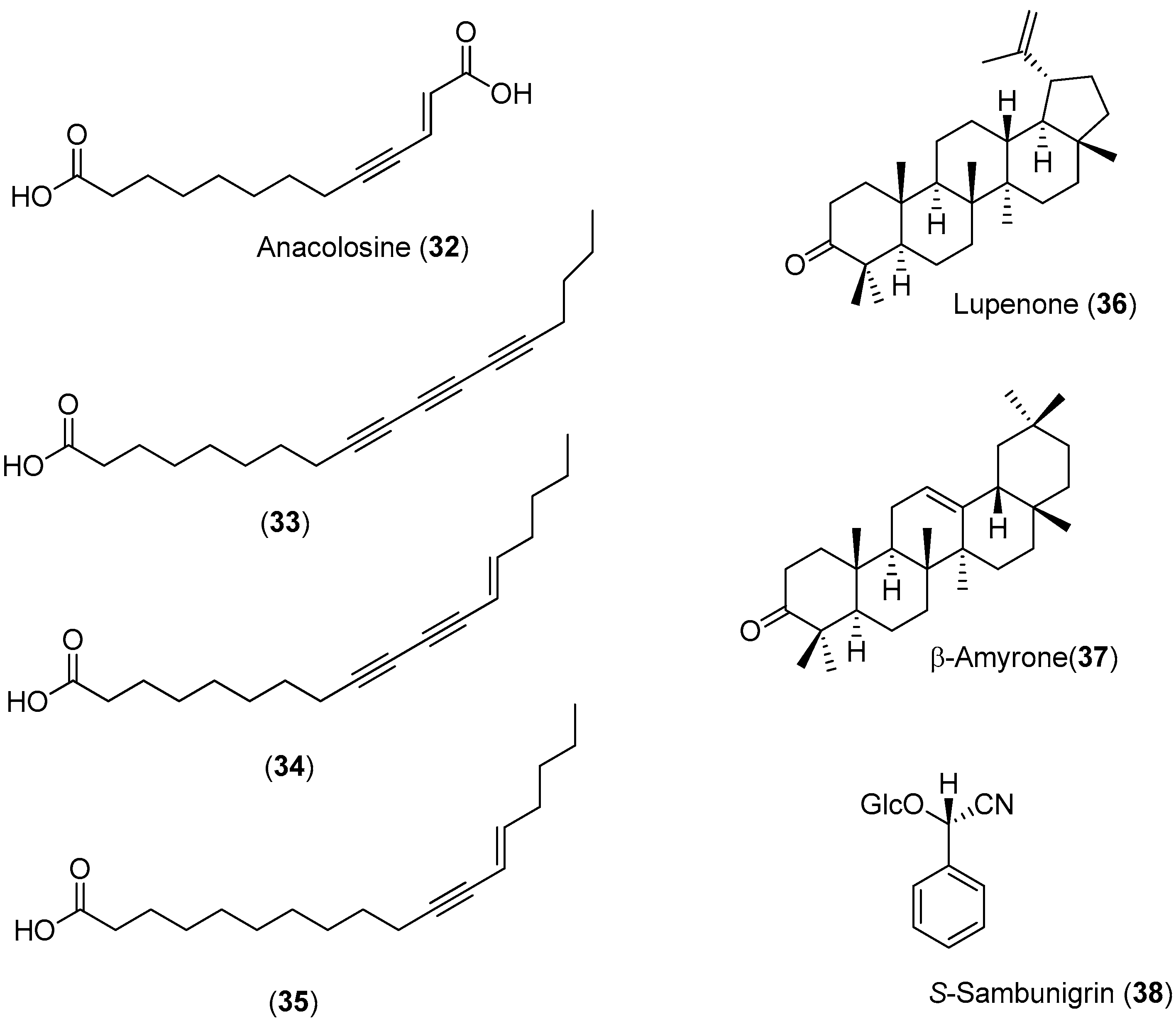 Anacolosa pervilleana is a Madagascan plant whose leaves, bark and young shoots are used in traditional medicines for the treatment of schistosomiasis, syphilis and general weakness. Four acetylenic carboxylic acids (Compounds 32–35), two triterpenes (Compounds 36 and 37) and one aromatic compound (Compound 38) were isolated from the leaf ethyl acetate extract of this species (Figure 5) [51].