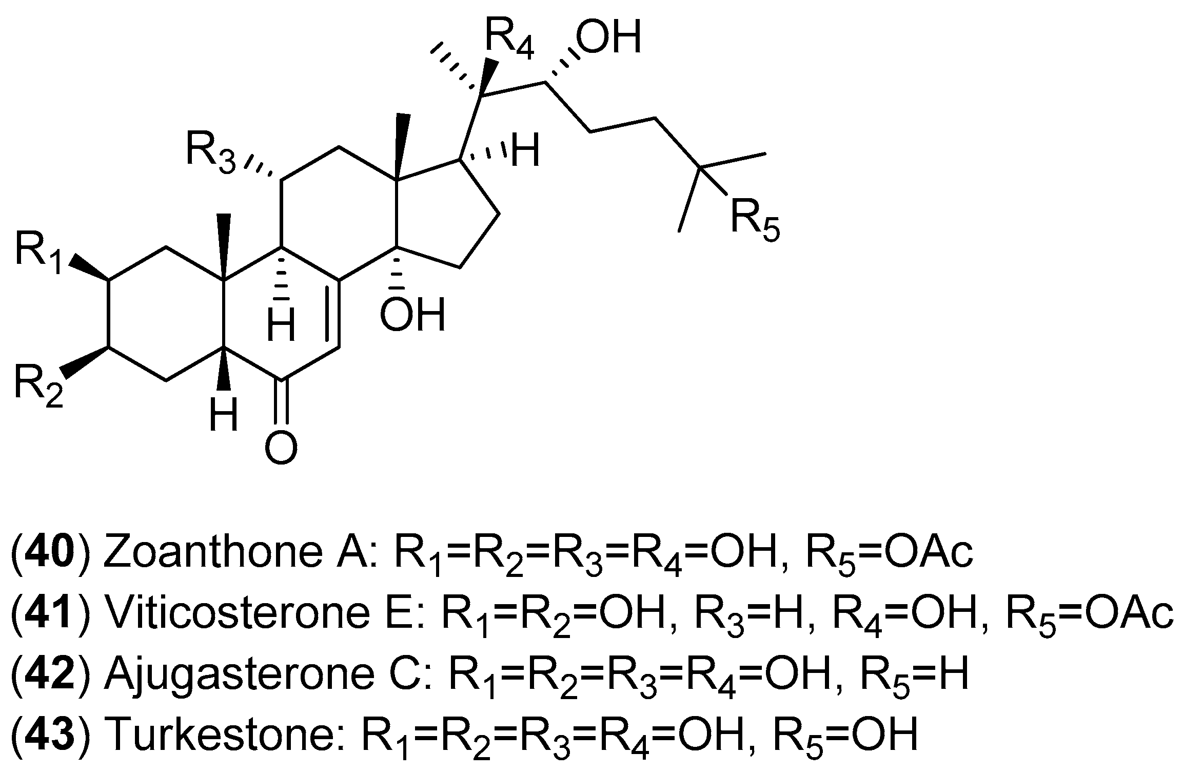 - Cheng, Y.-B.; Lee, J.-C.; Lo, I.-W.; Chen, S.-R.; Hu, H.-C.; Wu, Y.-H.; Wu, Y.-C.; Chang, F.-R. Ecdysones from Zoanthus spp. with inhibitory activity against dengue virus 2. Bioorg. Med. Chem. Lett. 2016, 26, 2344–2348. [Google Scholar] [CrossRef] [PubMed]