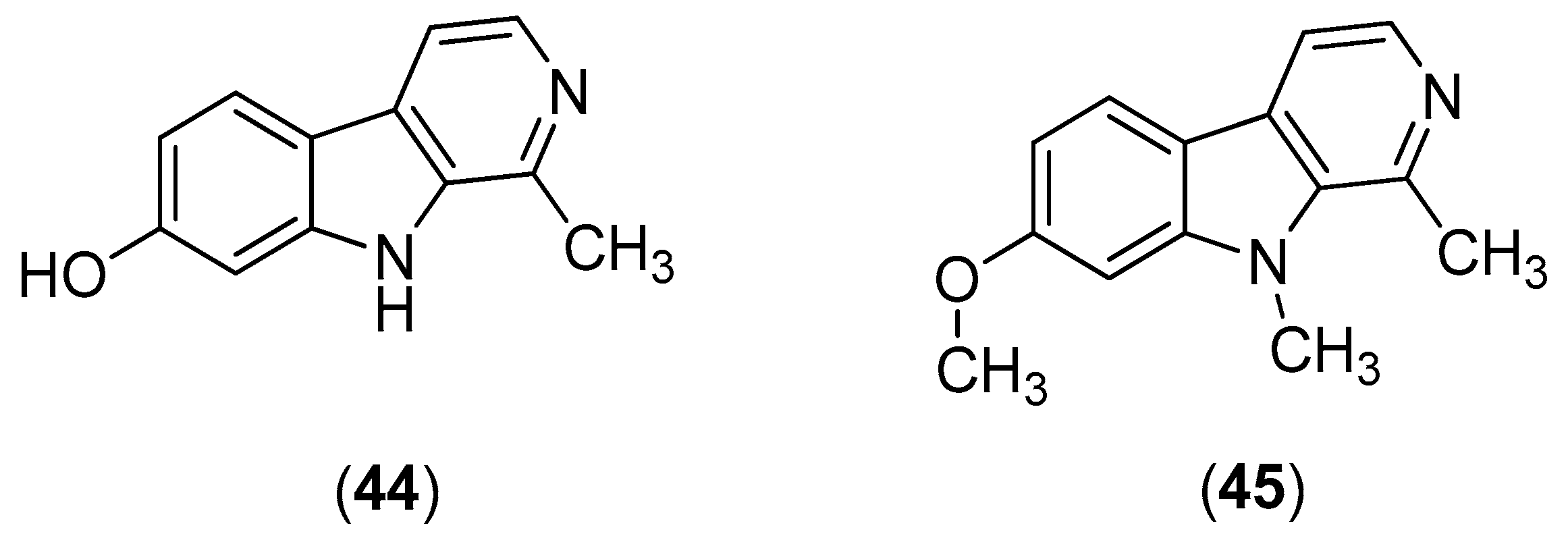 β-Carbolines harmol (Compound 44) and its synthetic derivative 9-N-methylharmine (Compound 45).