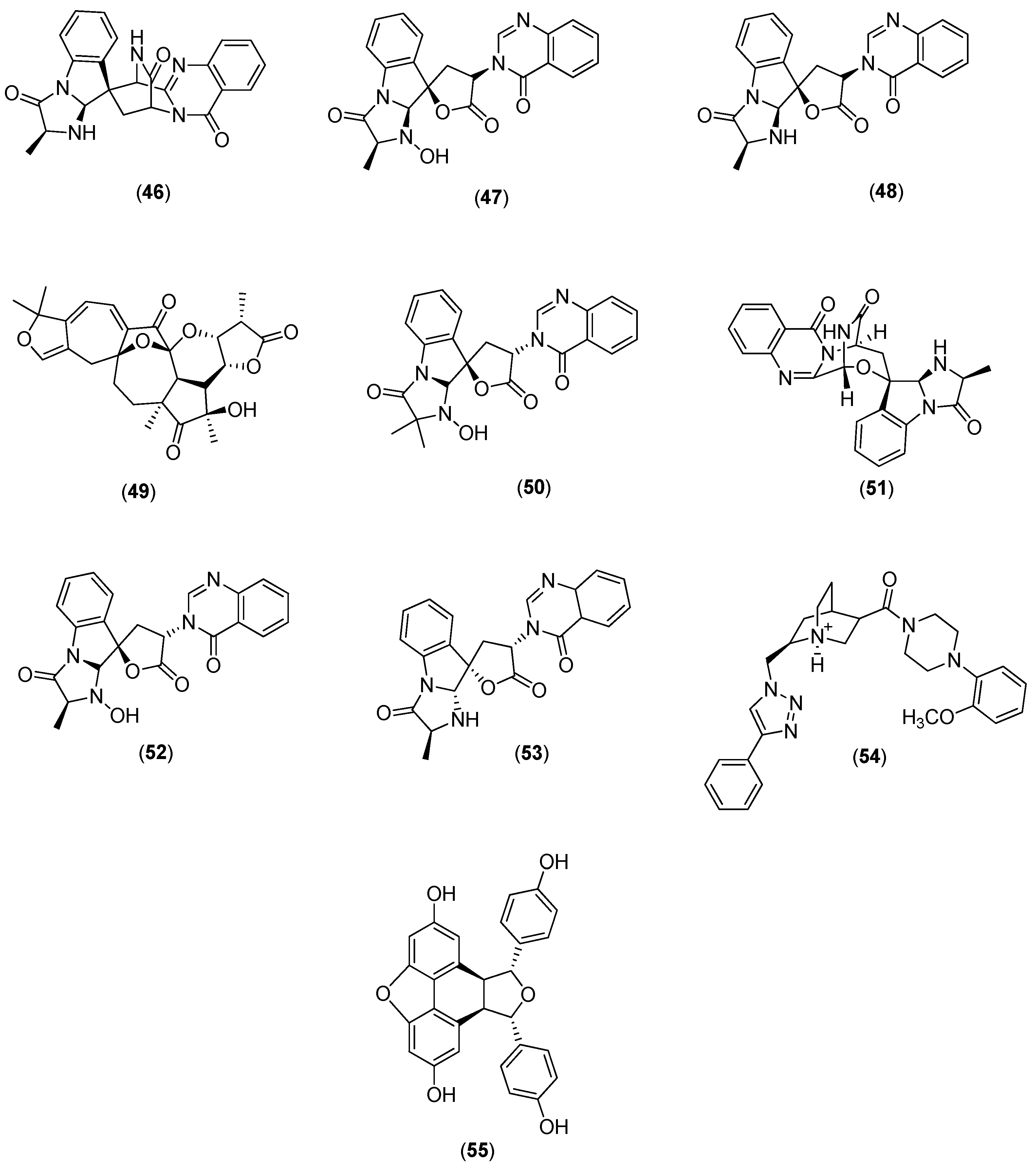 Galiano and co-authors conducted an in silico study to identify new inhibitors of the NS5 RdRp in the four DENV serotypes. They used a chemical library of 372,792 non-nucleotide compounds to perform molecular docking experiments at the binding site of the RNA template tunnel of the polymerase. After the screening process was completed, 39 compounds were identified as leading DENV RdRp inhibitor candidates. The selected compounds had a highly negative free energy variation (∆G) when docked to the binding site of the RNA template tunnel in the four DENV serotypes. In addition, the majority of the selected compounds had favorable druggability and optimal ADMET (absorption, distribution, metabolism, excretion, and toxicity) properties [57]. Among the 39 selected compounds, 10 (Compounds 46–55 in Figure 9) were natural products.