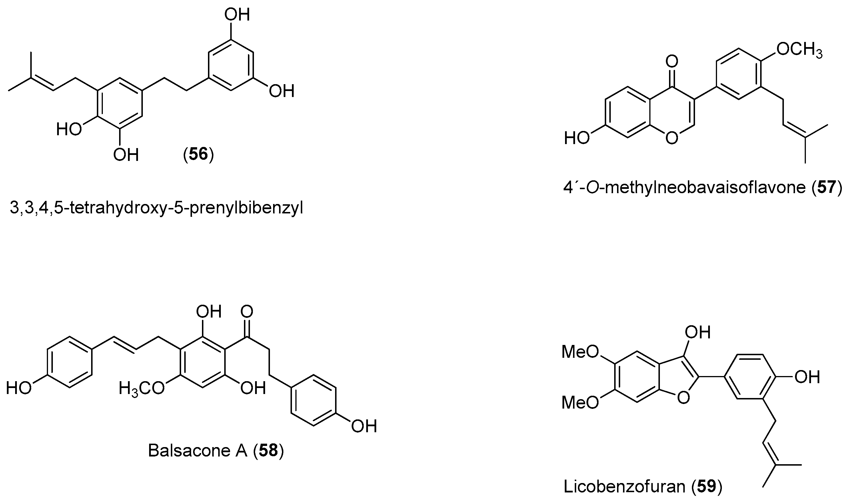 Recently, Power and Setzer reported an in silico investigation of natural products as potential antiviral agents against DENV protease (NS2B-NS3pro), helicase (NS3 helicase), MTase, RdRp and the virus envelope. A total of 2194 plant-derived natural products were docked. The compound set was composed of 290 alkaloids (68 indole alkaloids, 153 isoquinoline alkaloids, 5 quinoline alkaloids, 13 piperidine alkaloids, 14 steroidal alkaloids and 37 miscellaneous alkaloids), 678 terpenoids (47 monoterpenoids, 169 sesquiterpenoids, 265 diterpenoids, 81 steroids and 96 triterpenoids), 20 aurones, 81 chalcones, 349 flavonoids, 120 isoflavonoids, 74 lignans, 58 stilbenoids, 169 miscellaneous polyphenolic compounds, 100 coumarins, 28 xanthones, 67 quinones and 160 miscellaneous natural compounds. Polyphenolic compounds, flavonoids, chalcones and other phenolics were identified as the most strongly docking ligands for DENV protein targets [58], as shown in Figure 10 for selected ligands 56–59 for DENV NS2B-NS3.