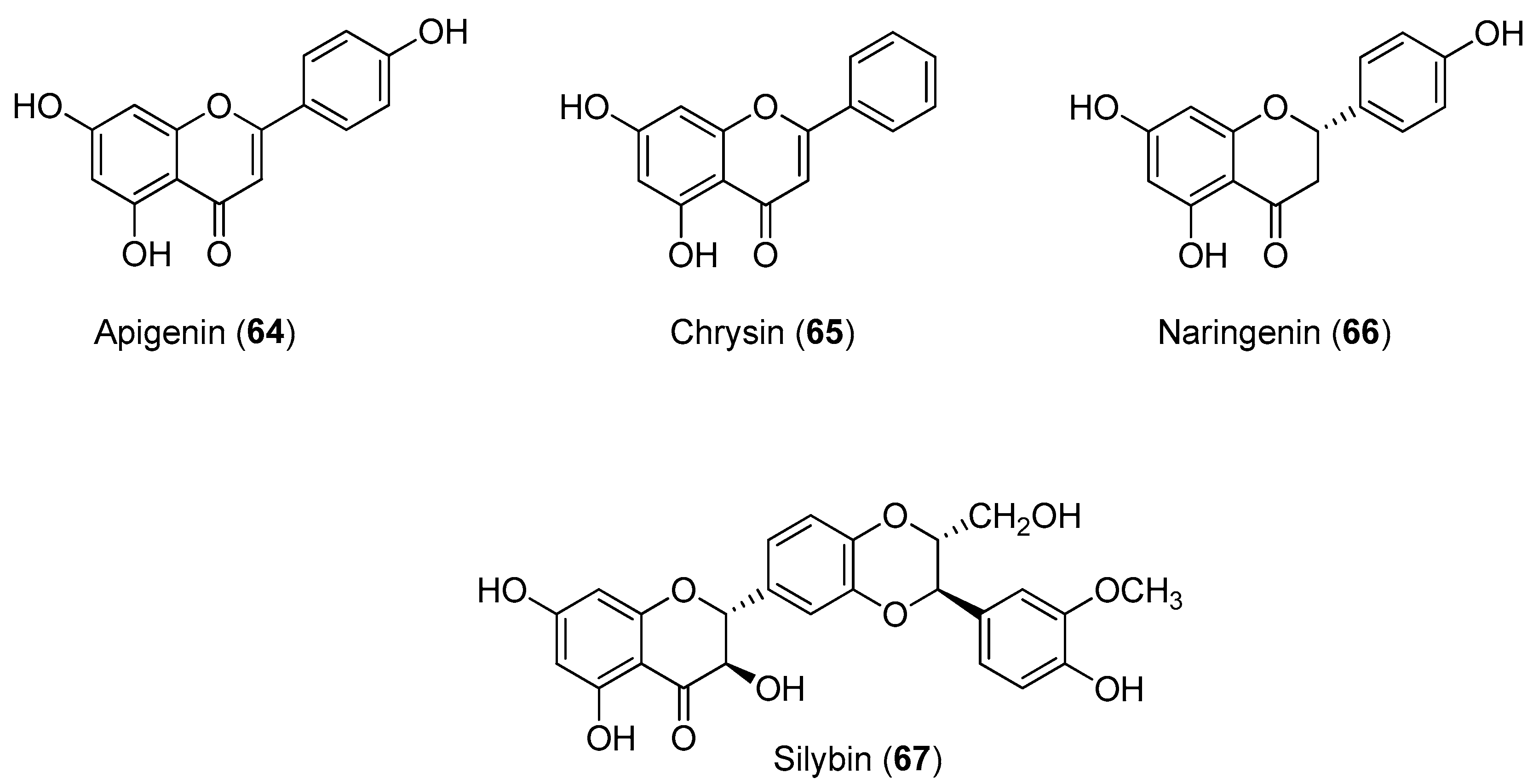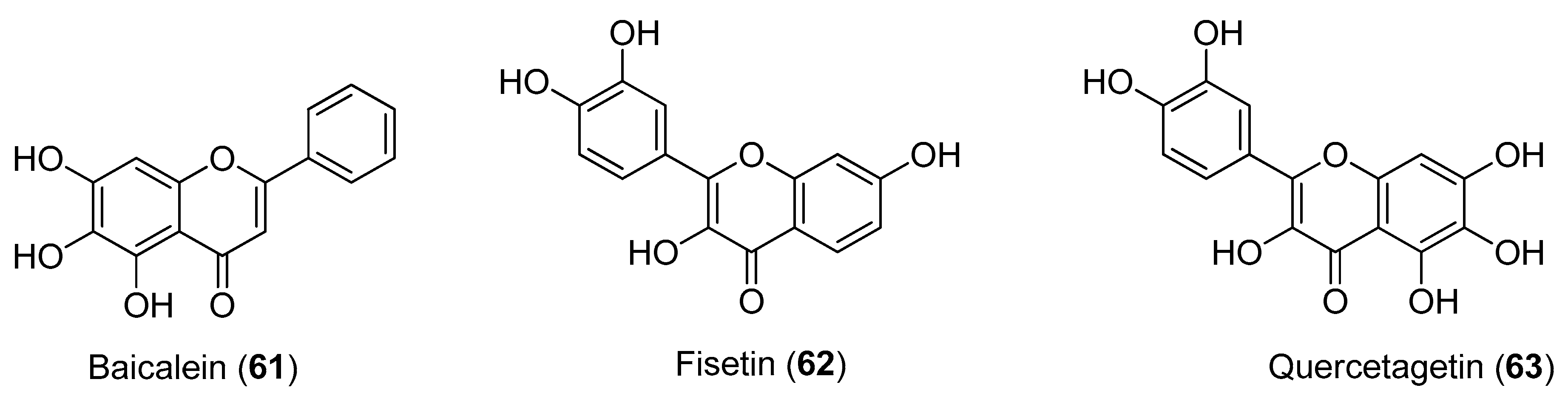 The flavonoids shown in Figure 12 were investigated for their inhibitory activities against CHIKV. qRT-PCR, immunofluorescence assay and western blot analyses all indicated that baicalein (Compound 61), fisetin (Compound 62) and quercetagetin (Compound 63) affect CHIKV RNA production and viral protein expression, with IC50 values of 1.89 μg/mL (6.99 μM), 8.44 μg/mL (29.5 μM) and 13.85 μg/mL (43.52 μM), respectively, and minimal cytotoxicity. These data provide the first evidence of the intracellular anti-CHIKV activities of these compounds [68].