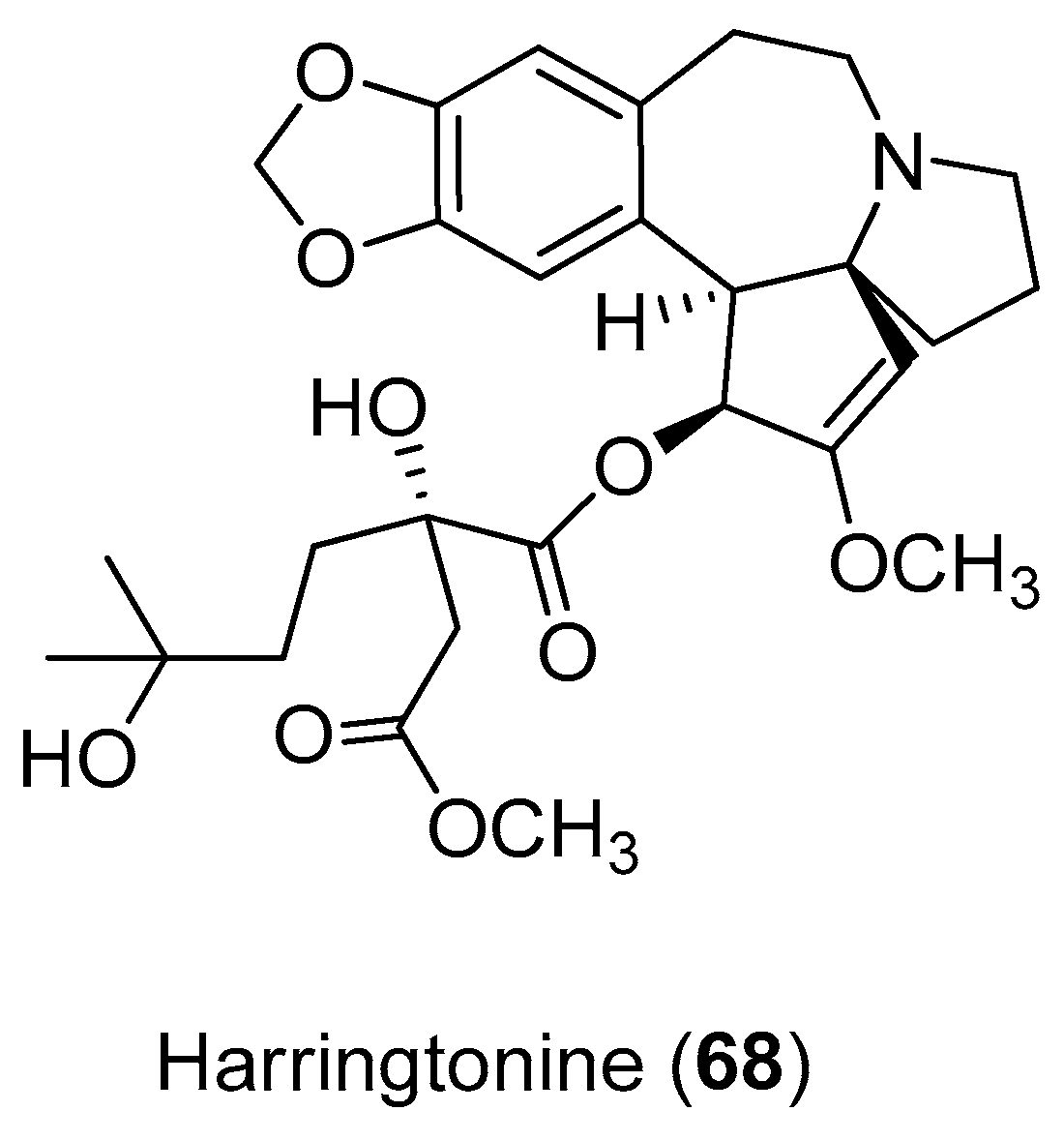 Harringtonine (Compound 68) (Figure 14), a cephalotaxine alkaloid, potently inhibited CHIKV infection (EC50 = 0.24 μM), with minimal cytotoxicity (cell viability >90%). Harringtonine treatment resulted in a significant dose-dependent reduction in both negative- and positive-sense RNAs in both CHIKV strains, suggesting that it inhibited a phase in the CHIKV replication cycle that occurs before RNA production. Additionally, results also suggest that this alkaloid may inhibit CHIKV protein production, leading to a decrease in infectious virus titers [70].