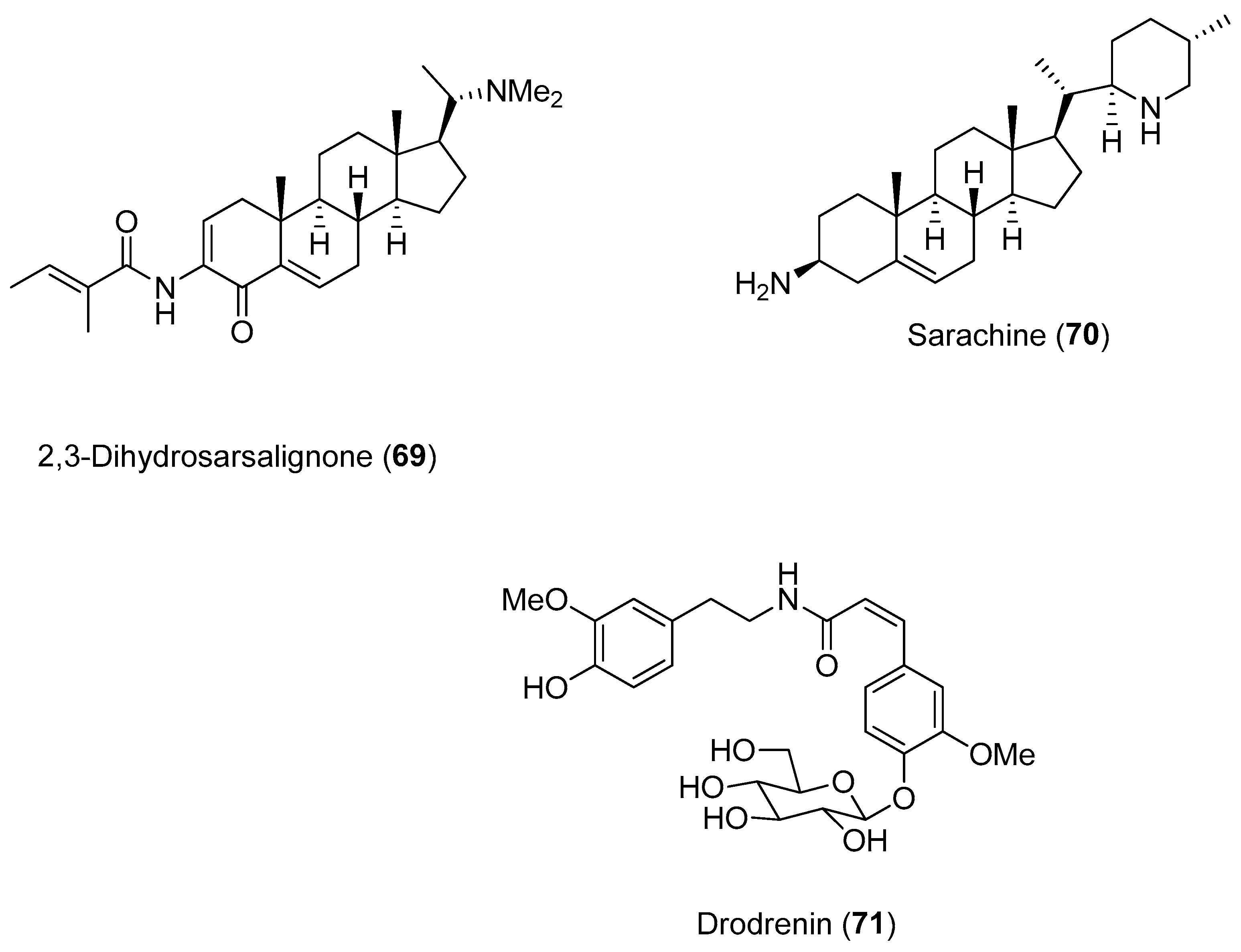 Setzer and collaborators conducted a molecular docking investigation to identify alphavirus protease inhibitors from natural compounds [72]. The inhibitory activities of 2174 natural substances were screened against several proteases, including nsP2 CHIKV. Several compounds presented notable docking energies and selectivities when screened against CHIKV nsP2, including the alkaloids 2,3-dehydrosarsalignone (Compound 69) and sarachine (Compound 70) (Figure 15). Both compounds occupy the same position in their lowest-energy docked position with the CHIKV protease.