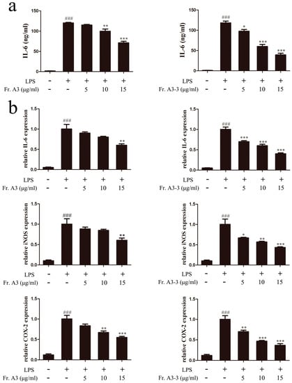 Effects of Fr. A3 and Fr. A3-3 on LPS-induced interleukin-6 (IL-6) release and the gene expression levels of IL-6, inducible nitric oxide synthase (iNOS) and cyclooxygenase-2 (COX-2). (a) Cells were pretreated with Fr. A3 and Fr. A3-3 in the presence of LPS (1 μg/mL) for 18 h. IL-6 level was measured by enzyme linked immunosorbent assay (ELISA) assay; (b) Gene levels of IL-6, iNOS and COX-2 expression were determined by quantitative real-time polymerase chain reaction (qRT-PCR). ### p < 0.001, compared to the control group; * p < 0.05, ** p < 0.01, *** p < 0.001, compared to the LPS-treated group.
