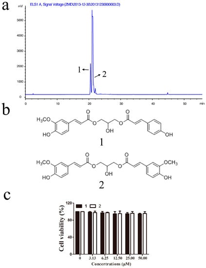 To find the active compounds, the Fr. A3-3 fraction was analyzed by high-performance liquid chromatography (HPLC) to find major peaks (Figure 3a) and further purified for the purpose of identifying the active chemical ingredient. Finally, this fraction afforded two known phenylpropenoid acylglycerols, 1-O-feruloyl-3-O-p-coumaroylglycerol (1) and 1,3-O-diferuloylglycerol (2) (Figure 3b). These two compounds were both previously obtained from the bulbs of L. auratum [20] and L. lancifolium [21], and compound 1 was also isolated from the aerial parts of Tillandsia streptocarpa [22]. Data of each compound were given in the Materials and Methods section.