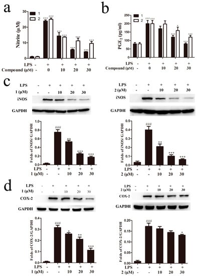 Anti-inflammatory activity study of compounds 1 and 2. Cells were treated with compounds 1 or 2 for 1 h and then co-incubated with 1 μg/mL LPS for 18 h. The NO production was determined by Griess assay (a) and the release of prostaglandin E2 (PGE2) was measured by ELISA assay (b); RAW264.7 cells were pretreated with compounds 1 or 2 and then incubated with LPS (1 μg/mL) for 18 h. Western blot assay was used to detect iNOS (c) and COX-2 protein expression (d). ### p < 0.001, compared to the control group; * p < 0.05, ** p < 0.01, *** p < 0.001, compared to the LPS-treated group. GAPDH: glyceraldehyde-3-phosphate dehydrogenase.