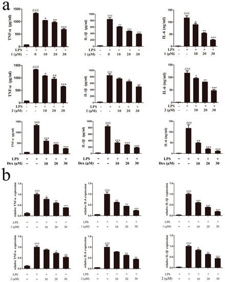 Inhibitory effect of compounds 1 and 2 on TNF-α, IL-6 and IL-1β expressions. (a) Cells were treated with compound 1 or 2 or dexamethasone for 1 h and then stimulated with 1 μg/mL LPS for 18 h. Production of TNF-α, IL-6, and IL-1β was examined by ELISA assay. (b) TNF-α, IL-6, and IL-1β gene expression levels were measured by qRT-PCR. ### p < 0.001, compared to the control group; * p < 0.05, ** p < 0.01, *** p < 0.001, compared to the LPS-treated group.