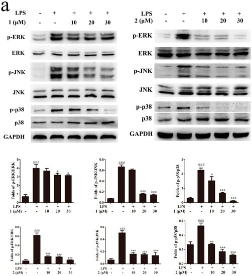 2.5. Inhibition of MAPKs and NF-κB Signaling Pathways Accounts for the Anti-Inflammatory Effect of Compounds 1 and 2