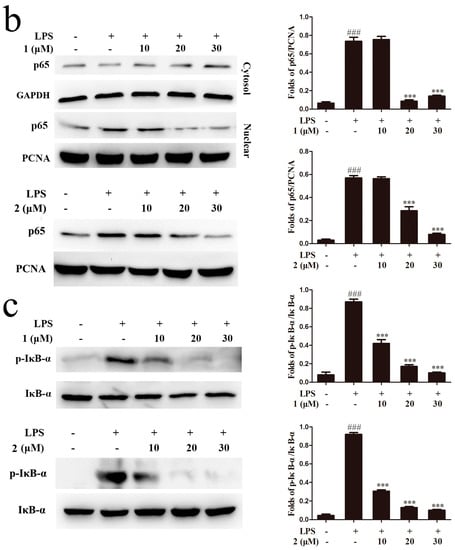 The anti-inflammatory mechanism study of compounds 1 and 2. RAW264.7 cells (106 cells/mL) were pretreated with different concentrations of 1 and 2 for 1 h and then incubated with LPS (1 μg/mL) for 18 h. (a) Protein levels of phosphorylated extracellular signal-regulated kinase (p-ERK), extracellular signal-regulated kinase (ERK), phosphorylated c-jun NH2-terminal kinase (p-JNK), c-jun NH2-terminal kinase (JNK), p38 mitogen activated protein kinase (p38) and phosphorylated p38 mitogen activated protein kinase (p-p38) were analyzed by using Western blotting; (b) Effects of 1 and 2 on nuclear translocation of NF-κB p65 were analyzed by using Western blotting; (c) Phosphorylation of I kappa B alpha (IκB-α) was analyzed by Western blotting. ### p < 0.001, compared to the control group; * p < 0.05, ** p < 0.01, *** p < 0.001, compared to the LPS-treated group. PCNA: proliferating cell nuclear antigen.