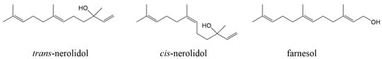 Structural formulae of used sesquiterpenes, trans-nerolidol, cis-nerolidol, and farnesol.