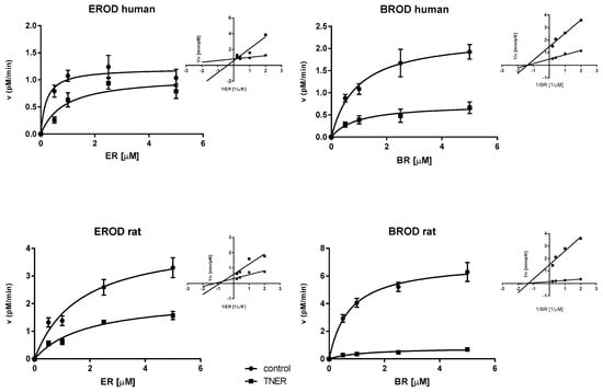 Michaelis-Menten plot of EROD and BROD activities in control and 5 µM TNER inhibited reactions. The human CYP1A2 (EROD human) was competitively inhibited and rat CYP1A2 (EROD rat) non-competitively. BROD activity was inhibited non-competitively by TNER both in human and rat. Human and rat liver microsomes were incubated with 0.5–5.0 µM ethoxyresorufin (ER) or benzyloxyresorufin (BR) in the absence (control) or presence of TNER. Lineweaver-Burke plots show the type of inhibition.