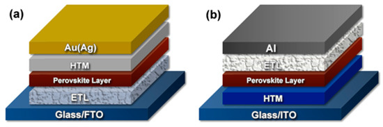 Structure of PVSK solar cells: (a) conventional device and (b) inverted device.