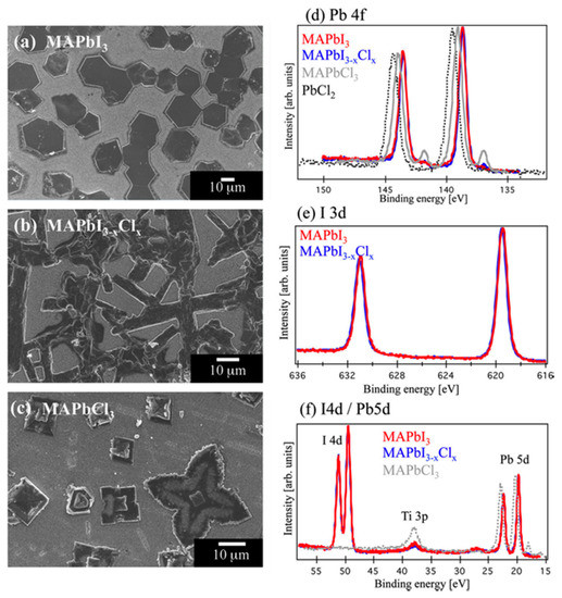 Top-view SEM images of (a) the MAPbI3 (red frame); (b) MAPbI3−xClx (blue frame); and (c) MAPbCl3 (gray frame) materials deposited on a TiO2/FTO substrate. (Horizontal scale bars = 10 mm.) Also shown are (d) Pb 4f spectra; (e) I 3d spectra; and (f) Pb 5d/I 4d spectra of MAPbI3 (red solid line), MAPbI3−xClx (blue solid line), and MAPbCl3 (light gray line) recorded with an excitation energy of 4000 eV [41]. Copyright © 2015, American Chemical Society, Washington, DC, USA.