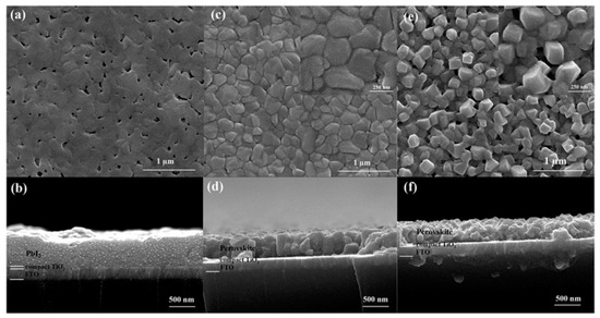 Figure 3 shows typical top-view (Figure 3a,c,e) and cross-sectional (Figure 3b,d,f) SEM images of PbI2, vapor-crystallized MAPbI3 and solution-crystallized MAPbI3, respectively. It can be seen that PbI2 almost covers the entire area of compact TiO2 smoothly with only few small voids, vapor-crystallized MAPbI3 perovskite demonstrates smooth surface with compactly aligned perovskite (Figure 3c), while solution-crystallized perovskite consisted of loosely accumulated cubic crystals (Figure 3e) with big voids and pinholes due to the chemical reaction between the CH3NH3I (MAI) solutions and PbI2-coated substrates. The yellow color of PbI2 was observed to change into dark brown immediately after dipping MAI solutions. The different preparation techniques of the MAPbI3 film could cause the variation in the reaction ratio between PbI2 and MAPbI3, which lead to different growth mechanism of the perovskite crystals. The vapor-crystallized MAPbI3 displayed more vertically oriented crystals than its counterpart solution-crystallized MAPbI3. In planar-structured solar cells, electrons must diffuse through the whole perovskite layer. Therefore, vertically oriented crystals are more desirable for electron transportation. Vapor-crystallized devices normally exhibit enhanced absorption, suppressed dark current and lower recombination rate. As a result, much higher PCE of 8.1%, was reported for vapor-crystallized devices with comparison of the efficiency of 5.8% for solution-crystallized devices [54]. Although the PCE results indicated that the vapor-crystallized method was favorable to the solution-crystallized method in terms of obtaining good photovoltaic performance, high device performance could still be attained with optimized solution crystallized technique. A solution route was reported for the deposition of uniform, large-grain, textured, and high-crystallinity planar MAPbI3 perovskite films with high-aspect-ratio grain structure [55]. Room-temperature solvent-bathing process was introduced to promote rapid nucleation/crystallization of MAPbI3 perovskite from the precursor film to suppress the grain growth. As a result, a maximum PCE of 18.3% for device size of 0.12 cm2 has been achieved.