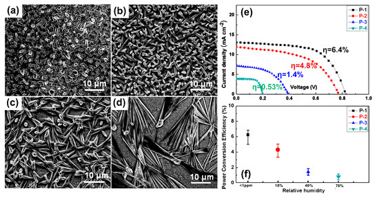 SEM images of perovskite MAPbI3 films deposited on mp-TiO2 layer under different ambient humidities, i.e., (a) <1 ppm (P-1); (b) 10% (P-2); (c) 40% (P-3) and (d) 70% (P-4); (e) J–V curves of the perovskite solar cells prepared under different ambient humidities of MAPbI3; (f) Dependence of the PCEs on RH. Each data point represents the mean from a set of 10 devices [60]. Copyright © 2015, American Chemical Society.