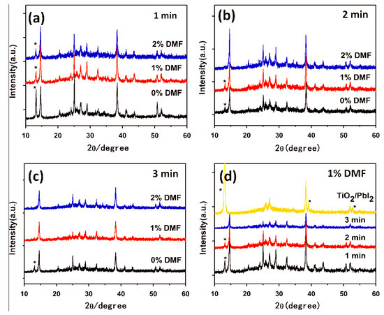 Effect of the ratio of DMF and dipping time on XRD patterns (a) 1 min; (b) 2 min; (c) 3 min; and (d) different dipping time with 1% DMF [76]. Copyright © 2015, Elsevier.