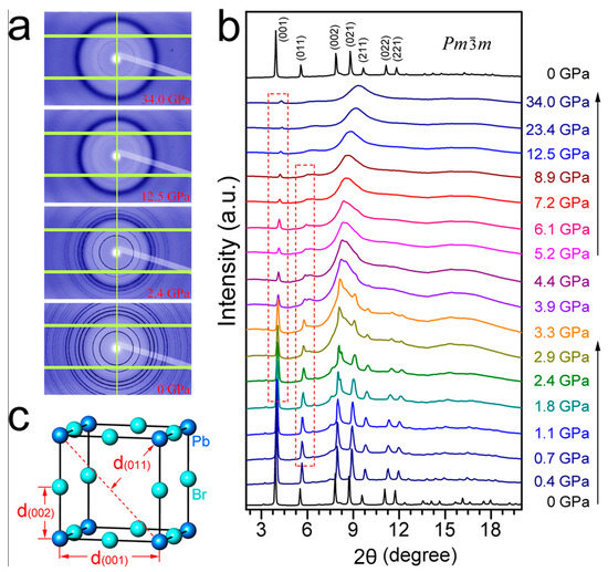 Synchrotron XRD patterns of MAPbBr3 obtained during compression up to 34.0 GPa and decompression: (a) The raw 2D XRD images and (b) integrated 1D XRD profiles. The XRD pattern after decompression can be indexed with the same crystal structure (space group Pmm) from the pristine materials; (c) Illustration of the representative interplanar distances in MAPbBr3 lattice (Only Pb and Br atoms are drawn for clarity) [81]. Copyright © 2015, American Chemical Society.