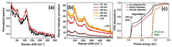 Figure 7a shows the Raman spectra taken at two different positions on a pristine MAPbI3 layer at a very low excitation laser power (10 μW at 514.5 nm). Figure 7b depicts the Raman spectra evolution induced by repeated measurement of the same MAPbI3 layer deposited on a c-Si wafer with the acquisition time of 60 s for each spectrum. The Raman spectra reveal two distinct bands at 52 and 110 cm−1 become stronger with samples degraded. The spectra unambiguously reveal that the final degradation products contain pure PbI2, degraded from MAPbI3. Figure 7c is the absorption spectra by the photo-thermal deflection spectroscopy (PDS) of MAPbI3 layers at various degradation states, which shows the absorption of MAPbI3 layers significantly reduced at wavelengths longer than 500 nm (photon energy below 2.4 eV) as the layers degraded [86].