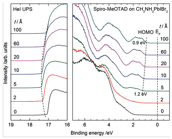 UPS is a method to determine the relevant information about the molecular energy level by measuring the energy distribution of the photoelectron excited by the ultraviolet light. It is found that spiro-MeOTAD deposition on perovskite substrates leads to the vacuum level (VL) shift toward higher binding energy at the initial deposition stage, while the progressive VL shift back to lower binding energy with increasing spiro-MeOTAD layer thickness. UPS is the most suitable method to characterize the energy shift. Figure 9 indicates the thickness dependences of UPS spectra of spiro-MeOTAD on MAPbIBr2. The way of the VL shift is in accordance with the research outcome that the change of molecular orientation from the initial monolayers to multilayers may induce the VL shift [92,93,94]. It is concluded that the energy level alignment between the perovskite and the HTM can facilitate efficient hole extraction with minimized recombination loss and high electron blocking capability. Therefore HTMs such as spiro-MeOTAD can form a staggered gap heterojunction. In contrary, the HTMs with deep-lying HOMO levels lead to an electron–hole recombination region, which function as a hole blocking layer [94]. Furthermore, XPS was also reported to analyze the chemical and electronic properties of MAPbI3−xClx perovskite films either spin-coated on mesoporous alumina or evaporated on Si substrates. The study reveals that the elimination of chloride lead to residual methylamine molecules (CH3NH2) trapped within the perovskite crystal lattice. Such molecules play a role in determining the complex defect mechanisms on the electronic behavior of MAPbI3−xClx perovskites [95].