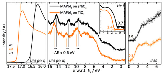 Figure 10 shows the UPS and IPES spectra of MAPbI3 on sNiOx and on TiO2, respectively. The onset of the C60 HOMO level is steady at 1.3–1.4 eV below EF for every layer thickness. On the other side of the bandgap, the onset of the LUMO level measured via IPES is at 0.9 eV above EF. These combined measurements yield an edge-to-edge HOMO–LUMO gap of 2.2–2.3 eV. Such results indicates that the perovskite layer itself becomes slightly p-doped when deposited on top of the NiOx film, as opposed to the common n-type doping characteristic on top of TiO2, hence a unique composition of free carriers and gap states established in MAPbI3.